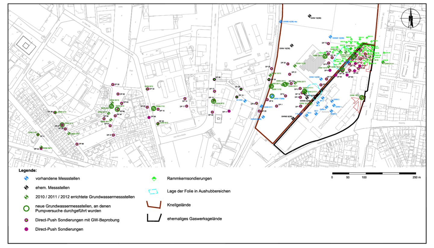 Im Zeitraum von 2009 bis 2011 wurden über 100 Sondierungsbohrungen (63 Direct-Push-Sondierungen mit Grundwasserprobenahme und 44 Rammkernsondierungen mit Bodenprobenahme) vorgenommen. Darüber hinaus wurden zu den bestehenden 14 Grundwassermessstellen 31 neue Messpunkte eingerichtet und ein Grundwassermonitoring durchgeführt.
