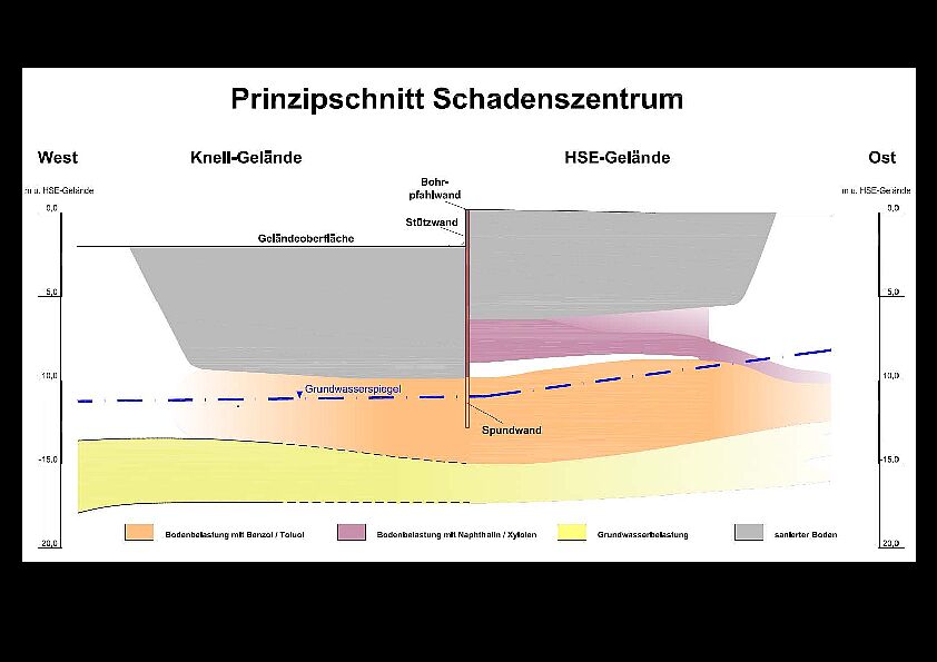 Von dort aus hat sich in den zurückliegenden Jahrzehnten eine schmale Schadstofffahne mit wasserlöslichen Stoffen rund 900 Meter in westliche Richtung ausgebildet. Das Grundwasser fließt in circa 10 Meter Tiefe und hat keine Verbindung zur Oberfläche. Trinkwasser ist von diesen Belastungen nicht betroffen.