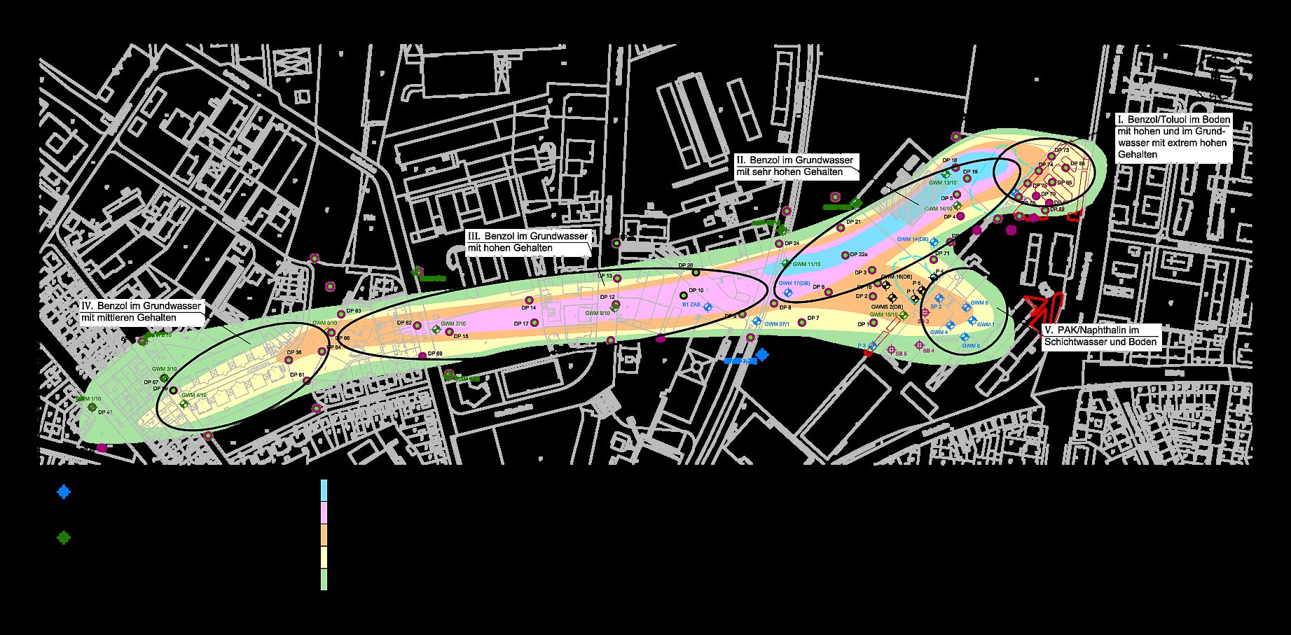 Bei der letzten Bodensanierungsmaßnahme im Jahr 2008 ergab sich erstmals der Nachweis auf tiefer reichende Kontaminationen bis in den grundwasserführenden Bereich. Die folgenden Untersuchungen in den Jahren 2009 und 2010 ergaben eine erhebliche Grundwasserbelastung im Abstrom des ehemaligen Gaswerksgeländes. In der Folge wurden weitere Untersuchungen durchgeführt, um die Grundwasserbelastung genauer einzugrenzen.