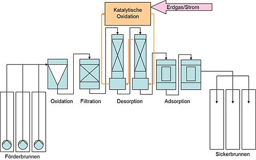Das Pump & Treat-Verfahren wird zur Entfernung der hohen Schadstoffgehalte im Grundwasser im Abstrom des Schadenszentrums eingesetzt. Pump & Treat ist ein hydraulisches Verfahren, bei dem man mittels Brunnen oder Drainage kontaminiertes Grundwasser fördert, es physikalisch und chemisch reinigt und es dann wieder versickert oder anderweitig ableitet. Durch die Entnahme des Grundwassers bildet sich ein Trichter aus, wodurch die natürliche Grundwasserfließrichtung in der Umgebung des Brunnens geändert wird und das Grundwasser von allen Seiten der Entnahmestelle zufließt.